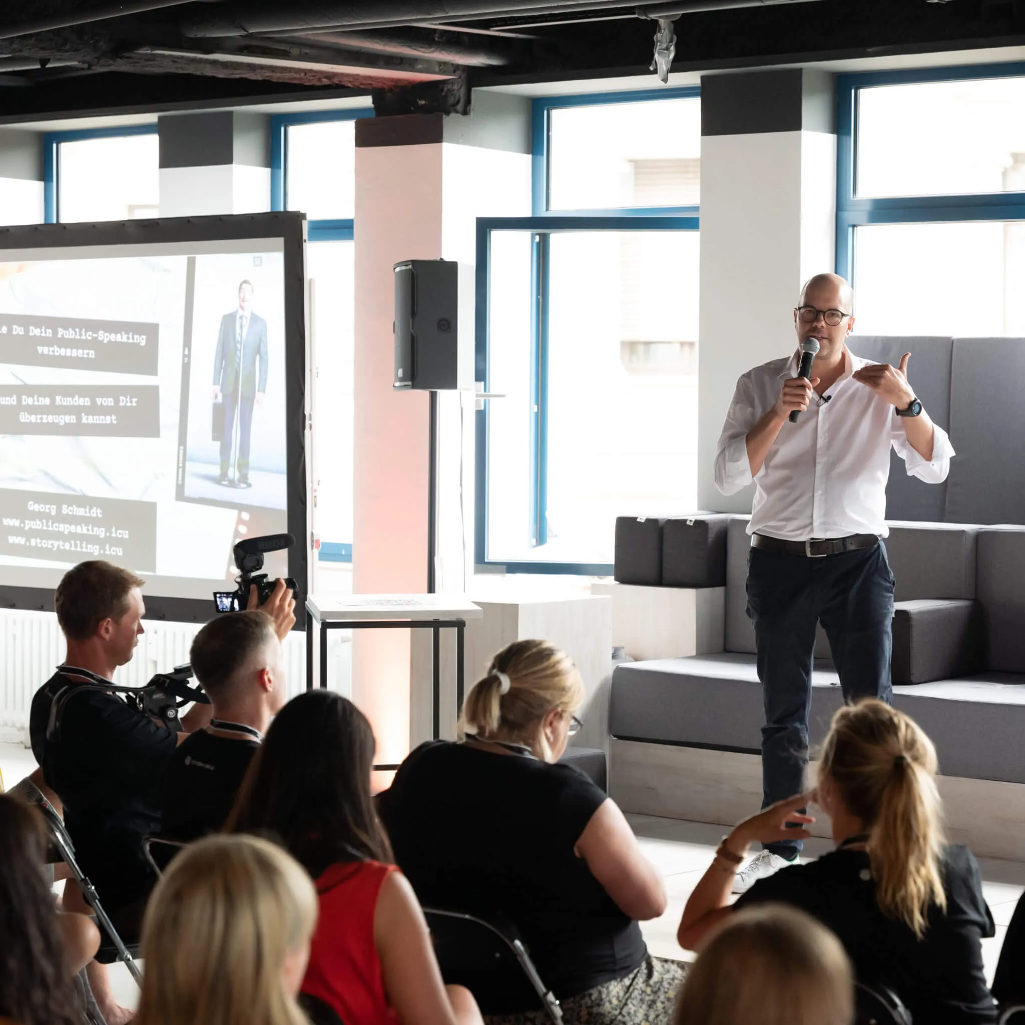 Heute helfe ich Unternehmen und Einzelpersonen dabei, sich in den Bereichen Rhetorik, Lampenfieber, Storytelling und Sales Pitching zu verbessern.
